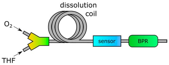 Reactor scheme of the sensor calibration step including Y-piece, dissolution coil, sensor and back pressure regulator.