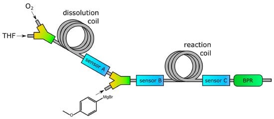The reactor was assembled similarly to the calibration system with an oxygen dissolution compartment and a sensor to record the initial O2 concentration before the reaction (Figure 4). A second Y-mixer is used to introduce the Grignard reagent into the system. Two more sensors are introduced into the system before and after a reaction coil, that provides reaction volume. A back pressure regulator keeps the reactor environment at 8 bar system pressure.