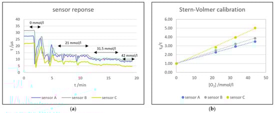 (a) recorded oxygen content during a multi-step calibration with four oxygen concentrations (0, 21, 31.5, 42 mmol/L O2); (b) Stern-Volmer plot of all three sensors showing the linearity of the calibrations despite diverging absolute lifetime values.