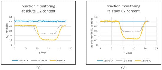 (a) absolute values of O2 measurements before, during and after the Grignard reaction; (b) dividing the oxygen concentrations by the sensor A control value (correcting the time delay and dilution factor) lead to stoichiometric oxygen consumption at different points of the reactor.