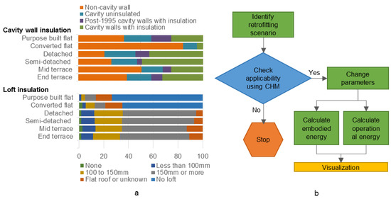 The steps of the project method are shown in Figure 1b. First, the most commonly used insulants were selected, as listed in Table 1. The walls and roofs are considered because of their significance in building heat loss, which also make them the preferred insulation refurbishment options. Follwoing this, applicable cases were identified from the CHM. Using the data in Table 2, the embodied energy values were calculated. First, total required mass of insulants was calculated for the applicable dwellings from the CHM data. The refurbishments were then applied to the CHM and the change in operational energy was be calculated. This calculation is done by changing the existing U-value of the building element to the new estimated U-value for the applied insulant. Finally, the operational energy gains were compared, which is calculated by subtracting the operational energy usage of refurbished homes from the operational energy usage prior to the refurbishment.