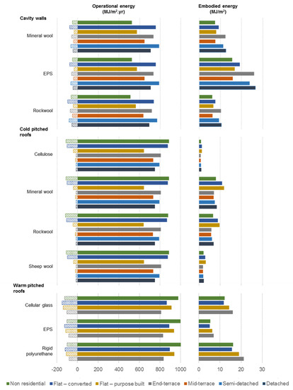 Figure 2 illustrates the operational energy, embodied energy and operational gains due to new insulants. The operational gains are shown as negative value in the left-hand chart. Mineral wool is found to the best insulant, considering both operational gain and embodied energy for cavity wall insulation. The greatest operational gains for cavity wall insulation are found to be for converted flats for all investigated insulation materials, closely followed by semi-detached buildings.