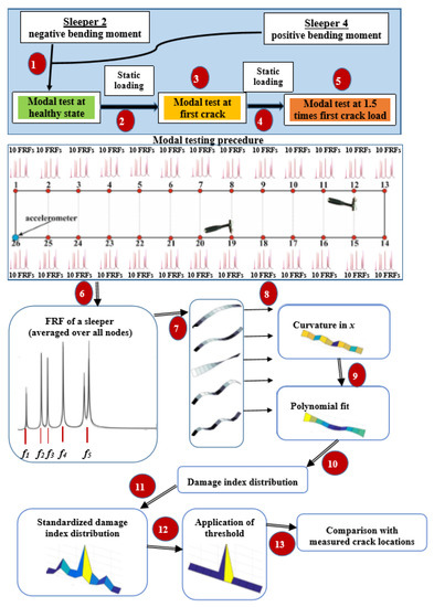 This study is the word first to demonstrate a novel identification technique that is able to locate crack damage in full-scale railway prestressed concrete sleepers. By using dynamic mode shapes of the sleepers, the curvature squares can be used to identify structural cracks in the sleepers. This novel approach adopts structural deflection shapes extracted from experimental modal analysis using an impact excitation [11,12,13,14,15]. In this study, the full-scale railway concrete sleepers are loaded to experience the first crack and exposed to 1.5 times above the first-crack loads using quasi-static loading regimes in accordance with the British Standard as shown in Figure 1.