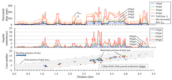 Figure 2 shows the maximum response of each structure and the derailment position of the train. Regarding the horizontal displacement and the angular rotation, almost all of the structures start to yield at around PGA of 200 gal and the maximum displacements increase substantially with higher PGA. The rotation angles are greater where the equivalent natural period differs widely between the structures that yielded and the adjoining structures. In addition, the result of the derailment position indicated that derailment occurred where the angular rotation is greater, suggesting that differential displacement (angular rotation) is more dominant than vibration displacement (horizontal displacement) in determining the train-running safety during the earthquake.