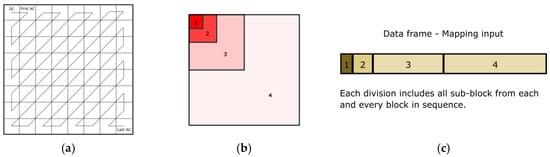 (a) The DCT is applied to each 8 × 8 pixel block. (b) Each 8 × 8 block is split into 4 sub-blocks in order to apply different analog mapping/transformation schemes. (c) Each sub-block is placed in a sequential data frame.