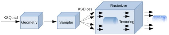 RPNS adds a new primitive to the input flow of the geometry stage, KSQuad. In addition, an intermediate stage, the sampler, is added between the geometry and the rasterization stages, as shown in Figure 1. In this stage, KSQuad primitives are sampled adaptively according to the point of view, the geometric characteristics of the surface, and the contour edges between surfaces. This sampling results in a set of sampling points or dices called KSDice that allow the surface to be rendered without cracks or holes. Each KSDice consists of a sampling point and additional information such as the parametric size of the matrix and the grade of the corresponding surface, and does not store any explicit connectivity information. KSDice is a primitive that can ultimately be projected to a single pixel or a set of pixels.
