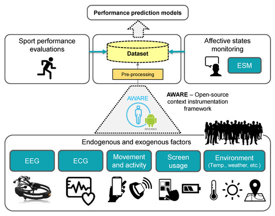 The data of both internal and external sensors is collected by the smartphone and sent to a server. There, it is unified in a dataset after a preprocessing stage, along with the affective state and sport performance data gathered. This dataset is aimed to be the starting point of several researches. First of all, it will allow us to model the variability of affective states in terms of the previously measured variables. Then, the link between the fluctuation of affective states and the measured sport performance could be analyzed.