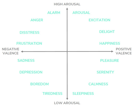 The affective state is measured using Russell’s circumplex model [26]. This dimensional model crosses two dimensions: valence and arousal, and affective states are constructed as combinations of varying degrees of these two independent dimensions. Valence is understood as the self-perceived level of pleasure of the actual affective state, from highly unpleasant to highly pleasant. Arousal, for its part, is the self-perceived level of activation, ranging from low—calmness—to high. Figure 2 shows some of the affective states which can be inferred using those dimensions. Although more dimensional models of emotion can be found in the literature—as the vector model [27] or the PANA model [28], the circumplex model’s easiness of use and reduced set of dimensions make it more suitable for a first approach of the affective state sampling.