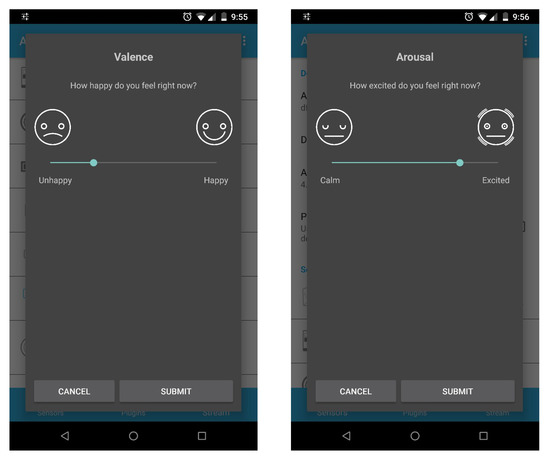 To measure the evolution of the affective state of the athlete, the system also takes advantage of user-provided context using the Experience Sampling Method (ESM) [24] through the smartphone. It allows for the collection of real-time subjective data about affective states in the natural environment repeatedly over time. The use of ESM beyond traditional text-based questionnaires has been successfully explored in recent works [25]. In order to take advantage of ESM, we have developed an AWARE plugin which triggers a short questionnaire that evaluates the user’s affective state at this precise instant. The ESM is triggered several times per day during the course of the study, since we need to record the evolution of the affective state as accurate as possible. It can be scheduled either at hours or at random hours, setting an interval during which the questionnaire is randomly triggered. The ESM is thrown as a push notification in the smartphone, which the athlete must click to start the questionnaire. Questions show up sequentially, and the ESM screen disappears once every question is answered, without leaving any background process. Both notification timeout and ESM screen expiration threshold can be previously configured.