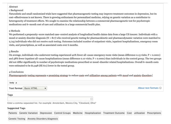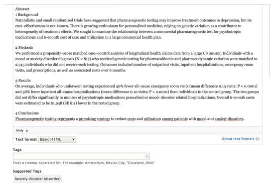 For privacy reasons, actual EHR medical records were not accessed to evaluate the proposed system. Instead, an instance of Drupal Content Management System (CMS) was deployed to emulate the EHR KMS. CMSs and KMSs are similar tools to managing information, with differences related to the treatment of this information and the objective of its management (https://sixfeetup.com/blog/kms-vs-CMS-what-differences). We randomly chose a set of articles about health topics and loaded their abstracts in Drupal. With the Auto Recommend Content Tags (https://www.drupal.org/project/auto_recommended_tags) plug-in configured, Drupal can invoke the semantic service provided by Apache Stanbol and thus, supporting users to visualise terms related to the text they are typing.