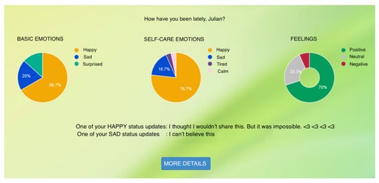 This research presents the development of a web application, called Analízate (in Spanish, analyze yourself), which reviews the status updates published on Facebook by a user to provide a visualization with feedback about their expressed emotions. The main goal was to design and develop a tool that could be integrated into a caregiver’s Facebook account, to use privately, processing all their shared data, and evaluating the person’s emotional journey regarding their child’s illness. The system developed was trained using information posted on Facebook by informal caregivers of pediatric cancer patients, and it was preliminarly evaluated with Facebook users, to identify relevant insights before testing it with caregivers. This was done because the parent caregivers are undergoing an extremely challenging period and therefore are of difficult access. This study was approved by the University ethical committee, project number 160622003.
