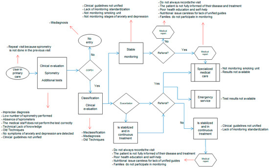 Nowadays, the COPD clinical process in primary care centers has a large number of inefficiencies and weaknesses. Among the main problems detected is the economic cost of the clinical process of COPD [7,8]. A factor that affects the cost of treatment is the high percentage of visits to primary schools due to exacerbations (10%) [21], the high cost of medications [22], inaccurate diagnosis or an inadequate use of diagnosis tests such as spirometries [21]. Moreover the number of physicians who perform the spirometry test in each of the visits is really low [22], either because the device is not available, or because the health personnel do not know in depth all the techniques and treatments of the disease, limited to old protocols [23]. In fact, less than 30% of the primary care centers have personnel expert in the use and performance of the diagnostic test of spirometry [24]. This implies a second visit to carry out the test. It is also highlighted that in the same diagnosis, there is a lack of detection of symptoms of depression and anxiety in patients with COPD, which often leads to worsening and worse recovery of the patient, especially in exacerbation status [25]. Elevated exacerbations in patients suffering from COPD is another of the weaknesses detected. It is also significant that a high percentage of patients with COPD continue to smoke (37%) [22]. This shortage has repercussions on both economic costs due to hospitalization and labor costs in terms of days of work [8].