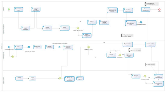 The redesign of the process shown in Figure 3 starts when the patient asks for an appointment. The information system generates a previous questionnaire to be completed by the patient. This questionnaire has simple but well-focused questions, and it allows detecting the possible cases of COPD patients in a generic way. The performance of a complete questionnaire allows us to know more accurately and therefore have more accurate information on the patient’s condition, saving time for the medical staff to re-evaluate the patient with the extra cost of patient care, in addition to being able to perform a more accurate diagnosis of the patient.