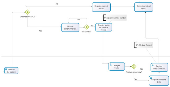 Once the clinical process has been analyzed and its problems and weaknesses have been detected, we are going to describe the redesign and modeling the COPD diagnosis sub-process. It is in this sub-process where most deficiencies are produced, which implies an additional cost, as well as a patient’s lower satisfaction. The diagnosis sub-process comprises the patient’s clinical evaluation, the spirometry test, and other optional complementary tests. The redesign process starts with the definition of the goals for the diagnosis of COPD patients who have not been previously diagnosed. The goals are: