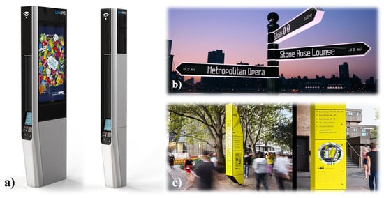Examples of different kiosk systems deployed on severals cities worldwide: (a) LinkNYC; (b) Points;and (c) UTS Wayfinding. Images property of their respective authors.