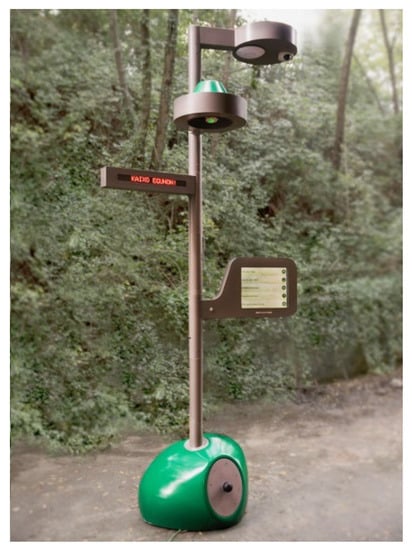 As a part of this citizen-city interaction system, the kiosk responds to users’ needs by offering contextualized information and services through a series of integrated features and visualization elements; panels, tactile screens or speakers. This smart kiosk also incorporates hardware platforms and built-in sensors to be in charge of measuring external variables and process them to react to their surroundings. To deal with the need for providing updated information, these contents are managed remotely through a custom built management system that allows to control the system and change the displayed information. To illustrate this concept, Figure 2 shows one of the existing kiosk and the set of components included on one of its possible configurations where the different modules define a whole structure. This particular schema was specially formulated for open spaces such as gardens, parks or natural environments to serve as a contextual information point, prioritizing a natural integration with the environment, being completely sealed up and protected from outdoor climate conditions.