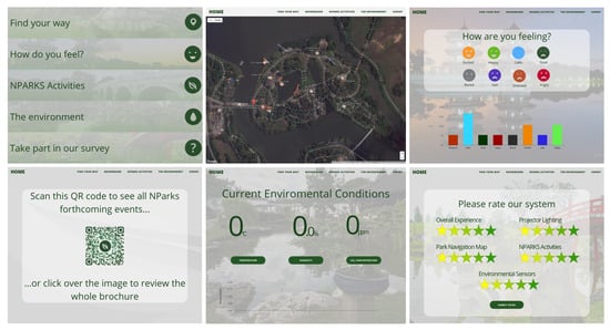The designed interface including the following sections (from top-left to bottom-right): Main screen, Maps, MoodBoard, Events and Activities and Survey. The images and logos appearing in these frames are property of NParks (https://www.nparks.gov.sg/).