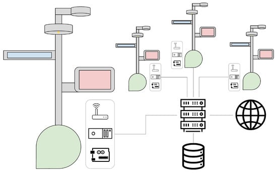 Schematic representation of the system architecture considering a network of multiple kiosks where every point of a network exchanges data with a remote server that hosts the management tools.