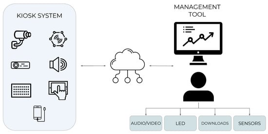 Additionally, the different images, logos or texts that appear on the interface of every section can be remotely changed through a simple and easy form available in the management site. This option contributes to the idea of customization and modularity followed in the whole design process, configuring a changing and updatable solution thought to suit in every context. Figure 5 represents the different elements contained in this current configuration of the smart kiosk and the services that can be controlled from the management tool website.