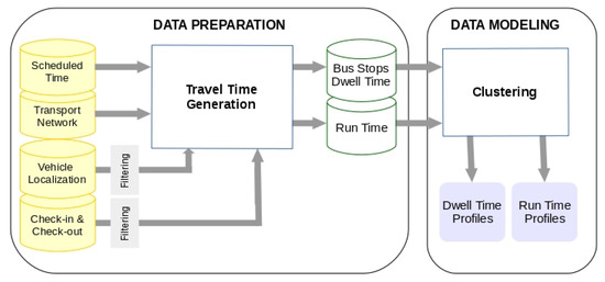 The presented work is developed in the context of Intelligent Transport Systems (ITS) for road-based mass transit systems, and its aim is to obtain key data for the continuous improvement of these. Specifically, the purpose is the estimation, for each line service made by a vehicle of the fleet, the time spent traveling the scheduled path between each pair of consecutive stops on the route and the time when the vehicle is stopped at each stop of the route. From these estimations computed for each line service, the proposed methodology, based on Data Mining, obtain the behaviour patterns of these times. Using these patterns, reliable service scheduling can be made and develop measures to reduce the travel time or its variability of the public transport routes. It should be noted that the travel time is a key factor to provide quality of service, because the traveller wants to make his trips in the shortest time and with foreseeable travel times. This goal is coherent with the current paradigm of ITS, this is based on the continuous observation of what happen in the transport network and a feedback to improve the transport systems, user-based to solve the people mobility problem [3]. To achieve this continuous observation of the transport network, the sensors systems and the data communication has a main role. In the proposed methodology, the positioning system, payment systems and mobile data communication used in the vehicles are key elements. In this point, the paradigm of cognitive transport network arises. In this particular one, the sensors installed in vehicles, infrastructures and user devices, acquire relevant data which is transmitted using different data communication technologies, recorded in the Transport Data Base (TDB) and processing using advanced techniques, such as Big Data or Data Mining, in order to obtain new knowledge to explain the behaviour of the transport network or to predict this behaviour.