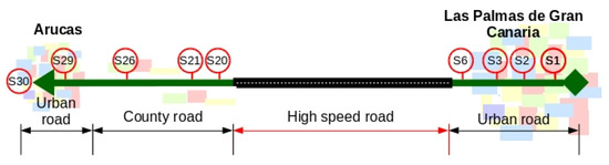 The studied line is identified by transport operator using the code 210. Therefore, in the proposed formalization the variable L adopts the value 201, that is L = 2010. The route of the line has 30 bus stops, covering 23 km, departing of an urban area and ending in other urban area. The route is formed by three sections: the first paths an urban area, the second is across a non-urban area using a highspeed road and a country road, and the third paths other urban area. Figure 3 shows a schematic representation of the line. In this representation, only the ten most used bus stops of the line are drawn and the cities crossed; starting at Las Palmas de Gran Canaria and ending at Arucas, both cities are in Gran Canaria island (Canary Islands, Spain).