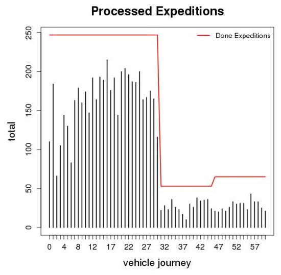 The goal of this phase is to obtain the {DW}210,2015 and {RT}210,2015, Applying the concepts and techniques of the Data Preparation Phase explained in the previous section. The first step consists of obtaining, from TDB, all the vehicle journeys of the line 210 during the year 2015, that is {VJ}210,2015. From the services scheduling of the year 2015, the number of vehicles journeys would be 9675. The next step is the subset of {VJ}210,2015 formed by coherent and complete vehicle journeys, that is {QVJ}210,2015. Following the methodology explained in the previous section, the number of vehicle journeys of {QVJ}210,2015 was of 7654. The reason of this difference, between theoretical number of scheduled vehicle journeys and the number of complete and coherent vehicle journeys registered in the TDB, could be due to data lost as consequence of device or data transmission faults. In Figure 4, the vehicles journeys of the line 210 during the year 2015 are represented. The red curve represents the theoretical number of vehicle journeys of each scheduling expedition and the vertical lines represent the complete and coherent vehicle journeys recovered from the TDB. The scheduled vehicle journeys are represented in the horizontal axis. The vehicle journeys identifiers between 1 and 31 correspond to vehicle journeys scheduled for Mondays to Friday (excluding public holidays). The vehicle journeys identifiers from 32 onwards correspond to vehicles journeys scheduled in Saturdays, Sundays and public holidays. The number of vehicle journeys processed is represented in the vertical axis.