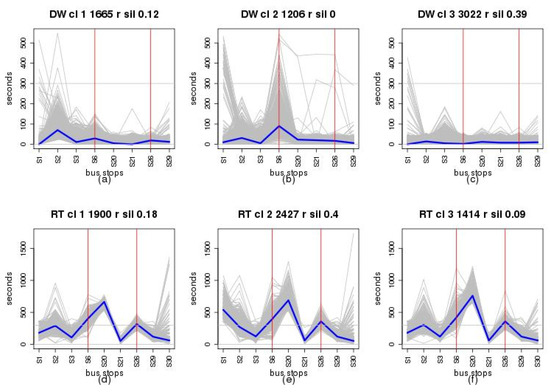 From the dwell and no-stop sun time datasets, {DW}210,2015 and {RT}210,2015, the goal of this phase is to know the behaviour patterns of these times. Specifically, the aim is to understand how certain time-dependent factors, such as the type of calendar day and the time of day, affect the behavior of these times. To this end, the k-Medoid clustering technique was applied to {DW}210,2015 and {RT}210,2015 datasets. The clustering technique was executed using three clusters. Figure 5a–c show the results for {DW}210,2015 and Figure 5d–f show the results for {RT}210,2015. To facilitate the graphic visualization in these figures, the ten most used bus stops of the analysed line are represented. These bus stops are 0, 1, 2, 3, 6, 20, 21, 26, 29 and 30. In the figures, the vertical axis represents the times (DW or RT), and the horizontal axis the stops analyzed. The three red vertical lines represent the three sections into which the route was initially divided: urban, intercity, and urban section. In each graph, the blue line represents the medoid of each resulting cluster group, and gray lines represents the elements classified in each cluster group. The elements number and the cohesion value computed by Silhouette function are presented in the top part of each graphic.