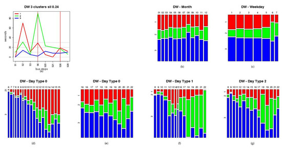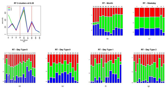 From the results obtained in the analysis of RT, it may be concluded that the behaviour of RT is very similar from bus stop number 3 to the end of the line, but different from the first bus stop to the bus stop number 3. This behaviour could be motivated by two causes. The first could be that segment of the route from first bus stop to the bus stop number 3 cross an urban are with very dense traffic at peak hours. The other possibility is that a significative number of vehicles journeys departures are delayed. As in the case of DW, using contingency tables to relate the frequency of each pattern with the temporal attributes. Figure 7a shows the medoids of each cluster. Figure 7b–c shows two contingency tables relating to patterns frequency with month and week day respectively. Figure 7d–e shows the contingency tables relating to patterns frequency with the scheduled departure hour of each vehicle journey in labour days (Mondays to Fridays). In these tables, the pattern two is the most frequent at hours which are not peak hours. The table showed in Figure 7f relates to patterns frequency with the scheduled departure hours in Saturdays. In this table, the pattern two is the most frequent at any departure hour. The last table, Figure 7g, shows the relationship between patterns frequency and scheduled departure hours in Sundays or public holidays. Also, this table shows that the pattern two is the most frequent for any departure hour. Because of these results, the conclusion is that this behaviour of RT is motivated by the second cause.
