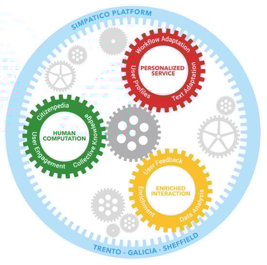 The goal of SIMPATICO is accomplished through a solution based on the interplay of language processing, machine learning and the wisdom of the crowd (represented by citizens, business organizations and civil servants) to change for the better the way citizens interact with the PA. SIMPATICO adapts the interaction process to the characteristics of each user profile; simplifies text and documents to make them understandable; enables feedback for the users on problems and difficulties in the interaction; engages civil servants, citizens and professionals so as to make use of their knowledge and integrate it in the system (Figure 1).