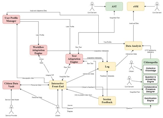 Front-end interaction and enrichment layer (yellow colour components). A second core objective of SIMPATICO is the improvement of the interaction process for each involved actor in the system (citizens, civil servants, companies). For that, SIMPATICO contributes with components for: (a) presenting the user with a fully featured Interactive Front-End for the SIMPATICO e-services, (b) provide the system’s analysis modules with data gathered from the interaction to propose improvements in future versions of the e-services and finally (c) a method of summarizing these proposed changes and provide the civil servants with useful information to improve the services. The Authoring Support Tool (AST) represents a set of instruments made available to the Civil Servant for creating, managing, and maintaining the e-services, their descriptions, simplifications, and model. Meanwhile, the e-Service Monitor (eSM)gets the available processed data from the interaction analysis pipeline (stored in the Interaction Data Log, processed by the Data Analysis component) and produces summaries of interaction issues that are presented to the Civil Servant so that the current status regarding a given e-service is quickly understood, and future versions of the interaction are optimized.
