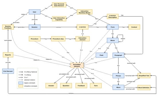 In the Figure 3 all the concepts needed to represent an administrative procedure are shown. This model also has some concepts that are not part of the PA domain language which are required by SIMPATICO components in order to improve the administrative procedures. The interaction between concepts are also represented in the figure.