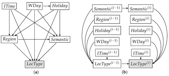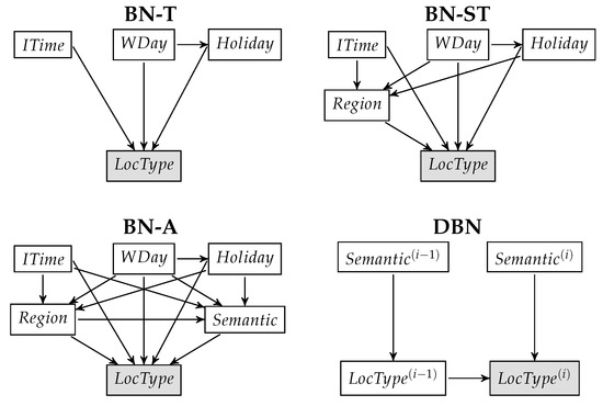 Figure 2. We also defined two more simple Bayesian networks along with the one with all features (BN-A): a Bayesian network with only the temporal context (BN-T) and another one with the spatial and temporal context (BN-ST). In addition of the Bayesian ones, we use other models for benchmarking: random choice of the user’s location types (referred to as RND), the most frequent location type choice (referred to as MODE), a first-order Markov chain model (referred to as MC) and a Probabilistic Finite Automaton (equivalent to a Weighted Finite Automaton) for the transitions between location types depending on the time interval (see [