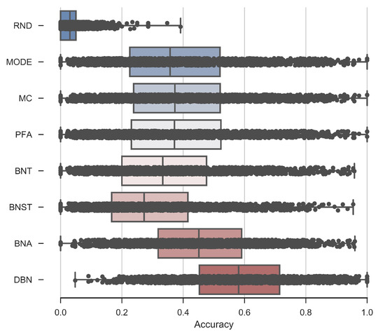 From the obtained results, we draw several conclusions. First, it is noticeable a very high variance in the accuracy values (represented as points in