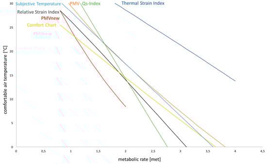 For this purpose, various indices were taken into consideration which allow a statement on thermal comfort. Due to its high profile, the Predicted Mean Vote (PMV) process was ultimately selected to calculate a thermally comfortable air temperature depending on the individual clothing and activity. It should be noted that further indices have been identified which allow the calculation of such an air temperature. Based on the different calculation methods, the automated living space can be individualized by selecting a method that calculates air temperatures that correspond to the user’s preferences. For example, if the user prefers a cooler indoor climate, the room air temperature is calculated with an index that calculates lower temperatures than the others under the same boundary conditions. The temperatures that can be determined with the various calculation methods are shown for illustration in