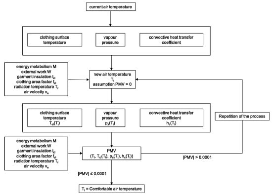 Accordingly, the aim is to determine a room air temperature which, under the existing climatic conditions of the room, as well as the consideration of clothing and activity, results in a PMV of zero. The general PMV formula is rearranged so that a thermal comfortable air temperature can be calculated under the condition that the PMV is zero. The condition that the PMV should be zero results from the fact that the indoor climate is considered thermally neutral and therefore comfortable when the PMV is zero. Since the air temperature is required to calculate the garment surface temperature, the vapor pressure and the convective heat transfer coefficient, an iterative solution process is used. For the first determination of these three variables, the current room air temperature is used; thus, a first thermally comfortable air temperature can be calculated on the assumption that the PMV equals 0. Then the convective heat transfer coefficient, the surface temperature and the vapor pressure are recalculated with the determined temperature. Subsequently, the usual PMV method is used to check whether the calculated air temperature, taking into account the climatic parameters actually prevailing in the room, fulfils the following condition.