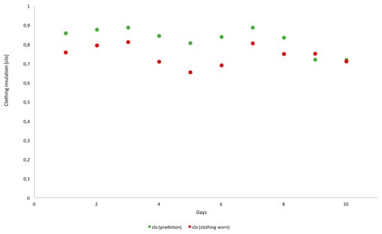 This connection is justified by the fact that people basically assume when choosing their clothes that the outside temperature today will be similar to yesterday. In addition, people are influenced by the weather forecast they hear on the radio or are told by their smartphone at the time when the dress selection takes place. In the context of this work, the above formula was reviewed for 10 days with a group of 10 people. However, the mean value of the outdoor air temperature over 24 h from the previous day was not used but only the mean outdoor air temperature in the period from 7 a.m. until 7 p.m. This is justified by the fact that this is the period in which people are not at home and perceive the outside air temperature. The results of this verification are shown in