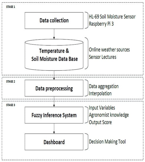 In summary a methodological framework is proposed, this includes data collection (sensors and online sources), data storage (online database), data pre-processing (system input variables), interpolation of the land humidity and temperature values to minimize the amount of sensors needed for a good representation of the variables, a fuzzy inference system whose output is a score based on the variables, and finally a visual decision-making tool (dashboard) with recommendations to help those in charge of the irrigation to make better and more informed decisions.