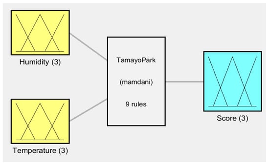 Figure 2 shows the proposed Fuzzy inference system (FIS). The FIS has 2 inputs, humidity with values from 1 to 100 (this unit represents the output voltage converted into the sensor humidity scale) and temperature with values from 14 to 30 (Celsius) for each quadrant. It also has 9 rules validated with the local team of agronomists and responsible of the park and green areas of San Isidro and the output that is a score from 1 to 100. There are 3 fuzzy sets for each input and output representing low, medium and high, this way of separating the information was also validated with the agronomists.