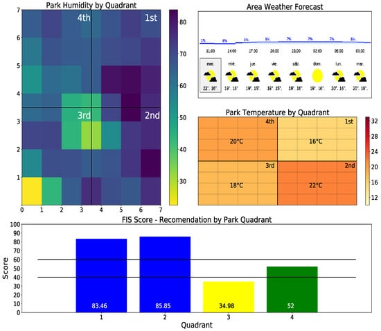 Figure 3 shows the proposed dashboard, there are 4 important figures: First, humidity and temperature maps for the park are presented to achieve real-time monitoring of the soil humidity and quadrant temperature. The humidity map of the park was constructed using the values obtained through the interpolation of the data collected by sensors, the temperature map was constructed using the average temperature from the total quadrant since the variations for the 18 points were not significant enough, this is because a variation of 1 or 2 units does not represent a big impact in the score calculated. Then, the hourly precipitation forecast for the day is presented, this forecast helps the agronomists in the decision of when to water the park. Finally, the dashboard also presents the fuzzy inference system output (scores) by quadrant with the recommendation interval given by the experts. The scores provide a clear measurement of the quality of the soil for each quadrant to the agronomists. In a real case scenario, the experts would combine the forecast, the maps and the score to take appropriate decisions for irrigation. For example, if the scores values of the quadrants are low but the precipitation forecast indicates that it is very likely to rain in the next hours the recommendation would be to not water the park. This is a very useful way of presenting the key performance indicators to the decision makers.