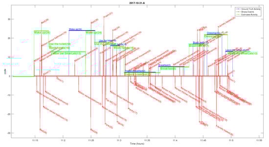 A sample of the sensor events that were registered in the morning of one of the testing days in our database is show in Figure 2. It can be seen the binary events (red spikes) which are labeled with their IDs at different heights to ease visualization. The activity ground-truth sequence (blue lines) and the estimated activities (green lines) are represented with different step-like lines with height offsets coding each of the 24 different types of activity. In a complete experimentation, additional events are generated in a similar way to the binary sensors, such as: the strongest BLE readings (those above −73 dBm), detections of floor tiles being stepped, and accelerations above a certain standard deviation. We do not show them on the same plot to avoid overlapping of information.