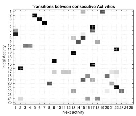 Transition matrix relating activities with the next activity (for seven-days training set).