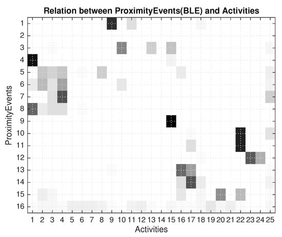 Measurement matrix relating proximity-BLE events with activities (for 7-days training set).