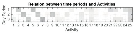 In order to take into account that some activities can only be performed at particular time intervals, we defined three time periods (morning, noon and afternoon). It is known that breakfast occurs during the morning, lunch at noon and dinner in the afternoon. We created the relation matrix as usual in above cases, in this occasion with a matrix of 3 rows (morning, noon and afternoon, coded as 1, 2 or 3 respectively) and the 24 activities. In Figure 7 we can see the learnt result.