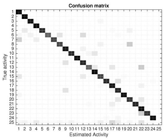 In Figure 2 we already showed one sample estimation of the activities detected for one fraction of the training tests done. We can see that the estimated activities (green step-like lines) follow up to a certain degree to the ground-truth activities (blue step-like lines). Activities are sometimes triggered incorrectly, or too soon; these results cause the generation of significant false positive, but also a majority of true positives. The overall detection results for the 7 days tests are shown in Figure 8 where a confusion matrix is presented. There is a predominant diagonal dark line, which represent the correct detections of activities, but also some off-diagonal estimations that represent estimation errors.