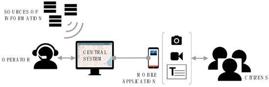 The architecture of the DKE for Early Warning: the central system receives information from external sources or from the operator and sends notifications to the mobile application; the mobile application receives notifications from the central system and allows citizens to send back photos, videos or textual information.