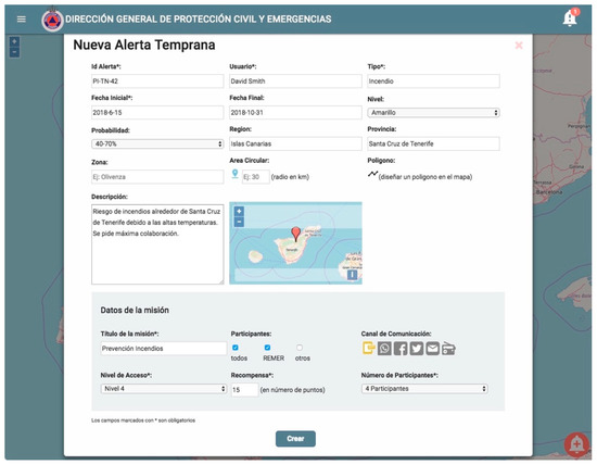 When there are precursors about a potential hazard, such as the expected high temperatures in the scenario, EM operators can create an Early Warning affecting a geographic area so that they can involve people in a checking process to get updated information on the status of the potentially affected area. Early Warnings are placed on the map as circles or polygons that EM operators can interact with to provide more information or to analyze the information collected by the participants in the tracking process of the hazard precursors. When creating the Early Warning, the EM operator can provide additional information about it, like the kind of hazard or its expected probability as shown in Figure 2. The interface of iWarn is in Spanish since it is the mother tongue of its expected users. Operators can also decide which kind of participants should be notified, distinguishing between official volunteers or citizens registered in the system and dwelling in the affected area. The way to send the early warning notification can also be selected to support multiple and redundant ways of communication, including text messages, notifications through the iWarn app, social networks and radio messages. Since the iWarn app is designed as a gamified environment (see next subsection), the operator can also determine issues concerning the game mechanics such as the award that will be received by participants when successfully completing the information gathering mission or the level required to participate in the mission.