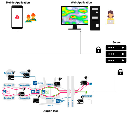 The proposed system (see Figure 1) allows monitoring different environment variables (such as humidity, temperature, carbon dioxide, etc.). Taking into account this application prototype, airport staff will be able to know in real time whether the environmental conditions of the entire airport terminal are the most appropriate for the health of users. The system has been specially designed for airport staff as it provides information on variations in air quality measurements inside and outside airports to ensure the comfort and healthy level of the facilities, and the safety of airport passengers and workers.