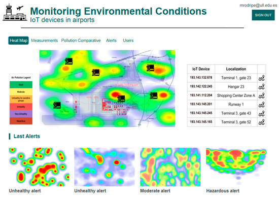 The web application (see Figure 2) included in the system is in charge of showing the collected ambient information and activating alerts in order to notify mobile application users (airport staff). The system shows a map of the airport terminal, including location of IoT devices, hazardous areas where sensitive material is stored, number of people in common user areas, heat map showing the level of air quality around the airport terminals and indication of the most polluted areas. All this ambient information is displayed in real time in the web application through different interactive elements, updated every time new measurements are taken and sent from IoT devices and sensors.