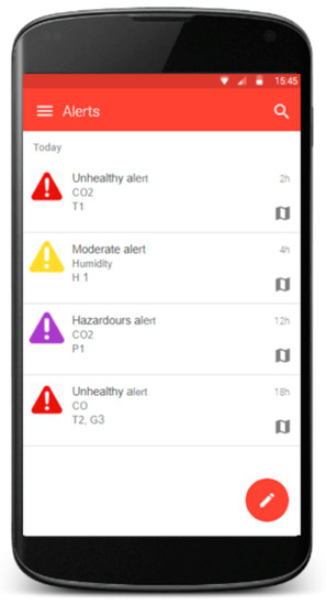 An Android mobile application is used as a fundamental part of the proposed system to represent the locations of IoT devices, and measurements and averages for each variable monitored through graphics that the users could easily interpret. In addition, this application is responsible for synchronizing notifications and alerts that have been sent from the server. In fact, one of the most important elements is the alert control panel, which is used to represent all notifications and alerts activated from the server when a measurement involves a danger to the health of airport users. Each alert notification received informs about the exact area associated with the hazard, the variable (s) that have determined the alert, and a description to identify exactly what danger it implies (see Figure 4).