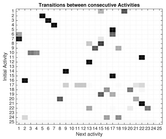 Transition matrix relating activities with the next activity, obtained from the seven days training set.